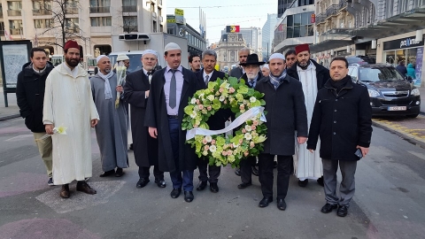 Ce vendredi 1er avril à 10h30, le Président de l'Exécutif des Musulmans de Belgique, Salah ECHALLAOUI, était présent à la Place de la Bourse, en compagnie du Grand Rabbin de Bruxelles, Albert GUIGUI, et de plusieurs imams belges.