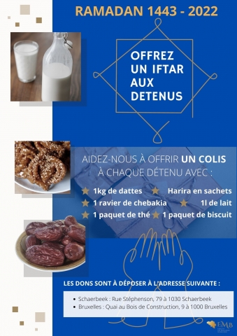 Comme les années précédentes, à l’occasion de l’opération de distribution des colis pour les détenus durant le Jeûne du mois de Ramadan, nous souhaitons faire appel à votre générosité et à votre solidarité envers les détenus dont beaucoup d’entre eux sont sans famille.